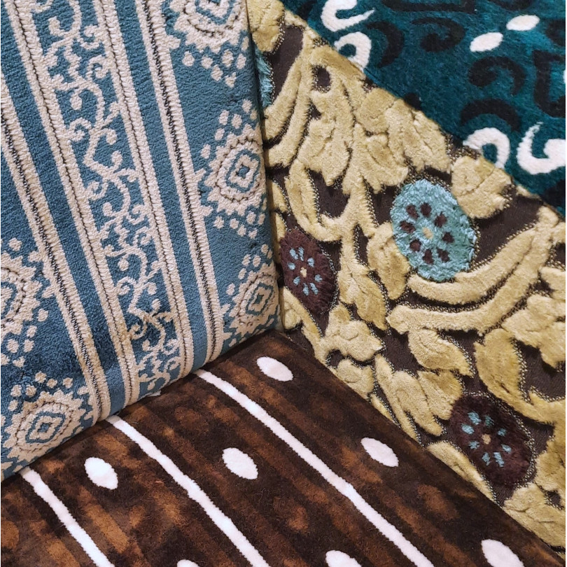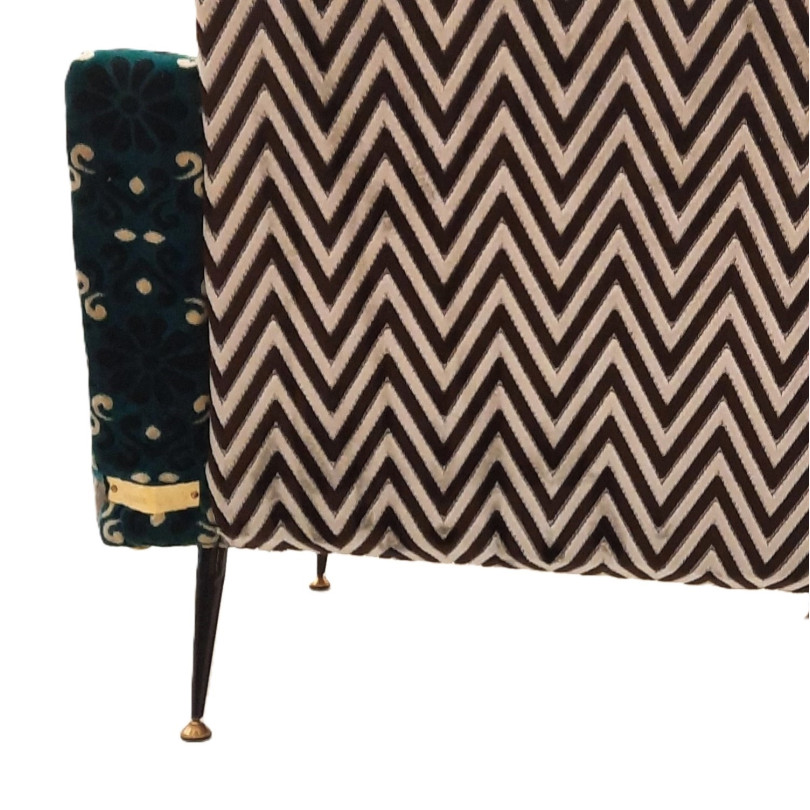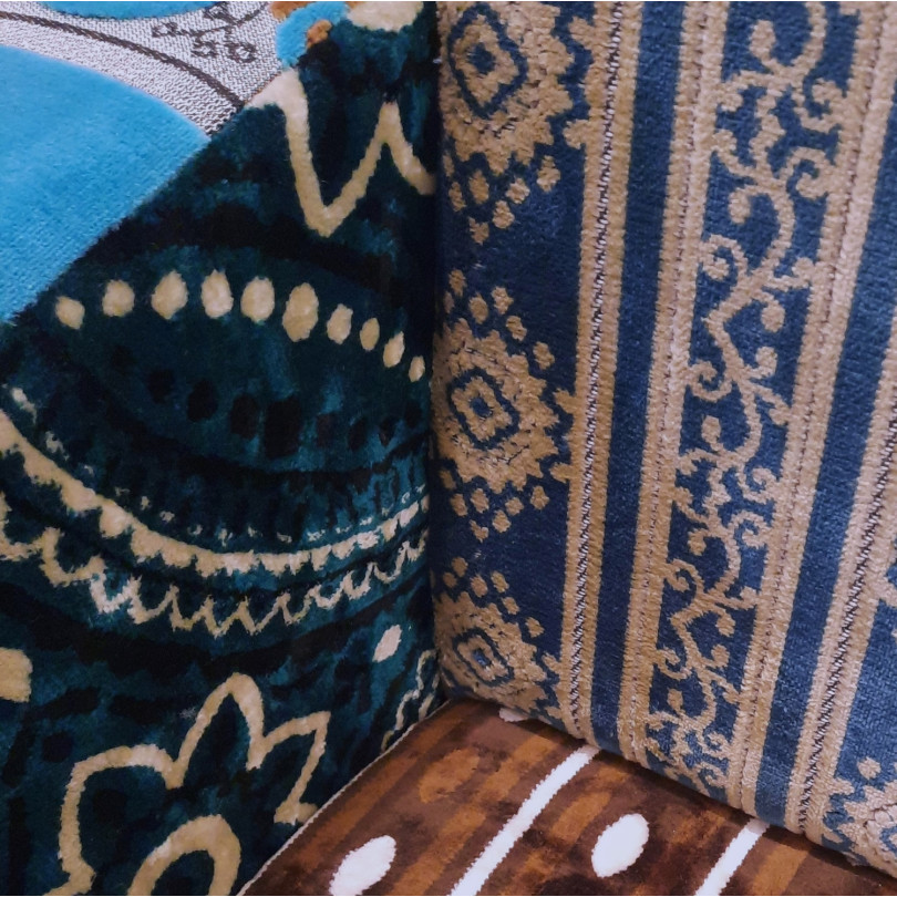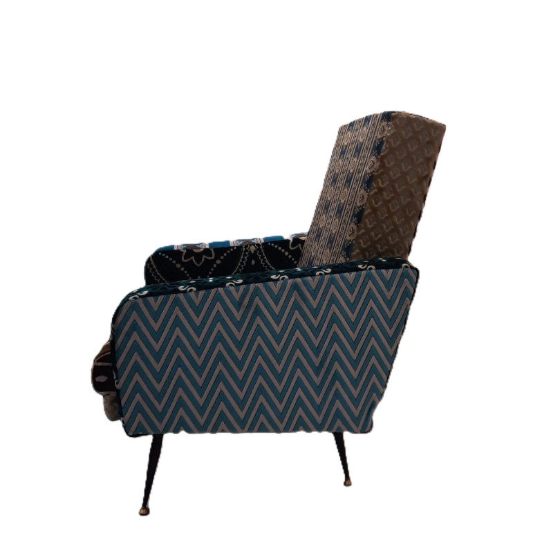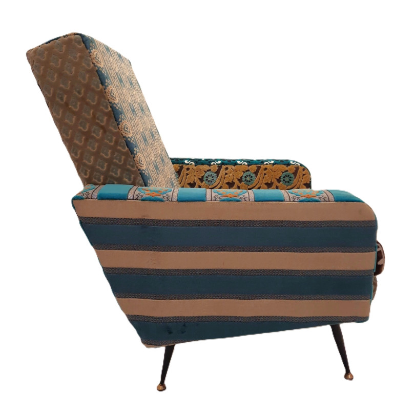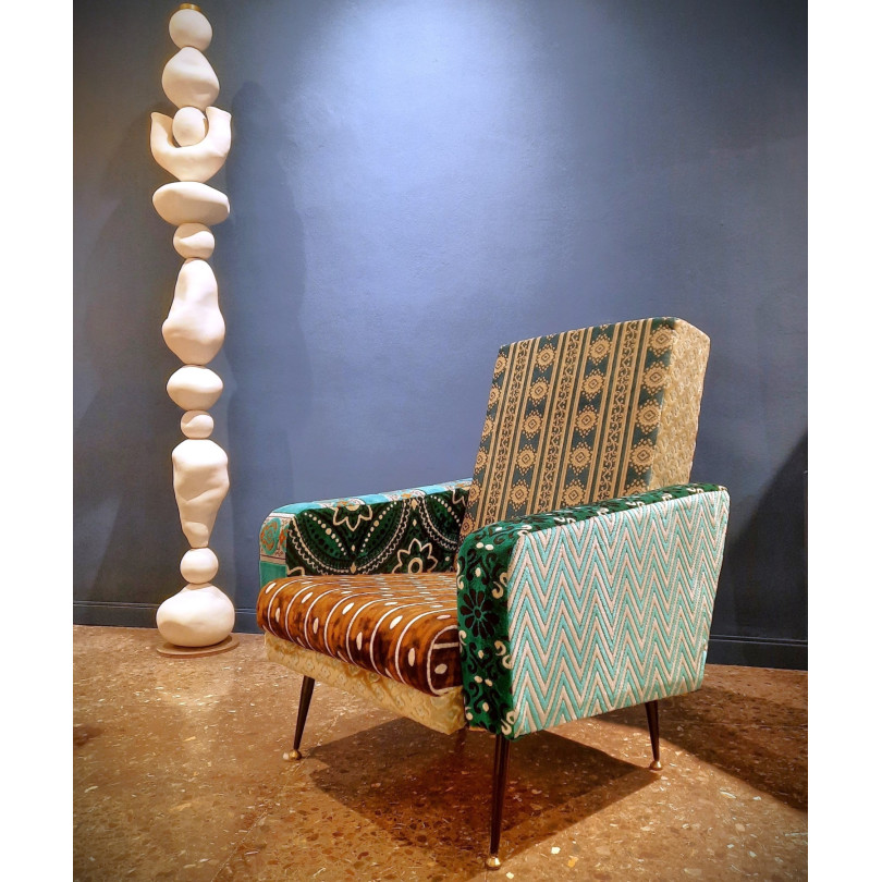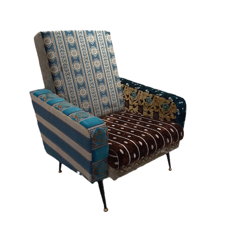 BORA armchair in boho-chic style, created and crafted by Maguela Tarami for ICI ET LÀ. 2025 Collection. Maguela Tarami's seating pieces are characterized by original upholstery work, featuring a joyful combination of colorful velvets with varied patterns. Each armchair in this collection is a unique piece.