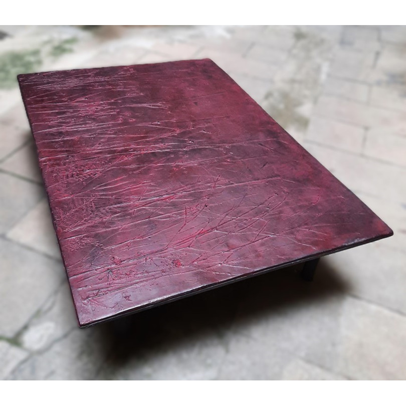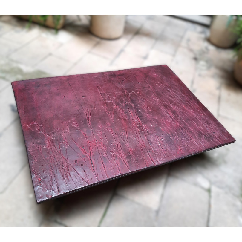 Sculptural and captivating, the "Empreintes 22" coffee table stands as a true work of art within a living space. Its deep red and black-hued tabletop reveals a mesmerizing organic texture, where delicate botanical imprints seem to freeze time within the material.