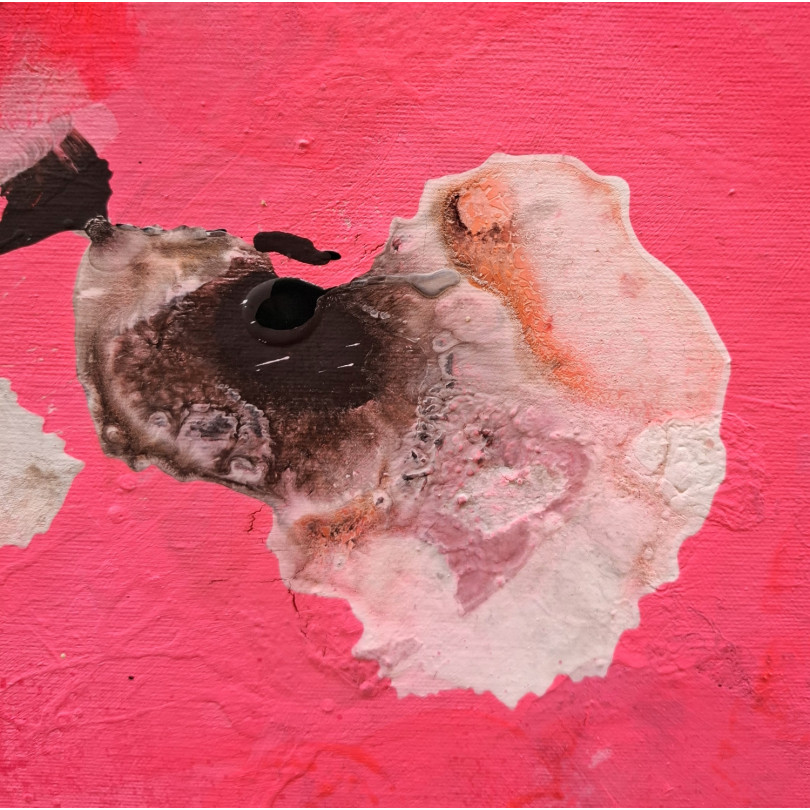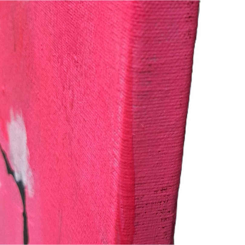 This vibrant art piece features white, gray, and blue flowers floating on a radiant pink background, connected by fine, flowing lines. It blends energy and delicacy in a composition that is both dynamic and poetic.