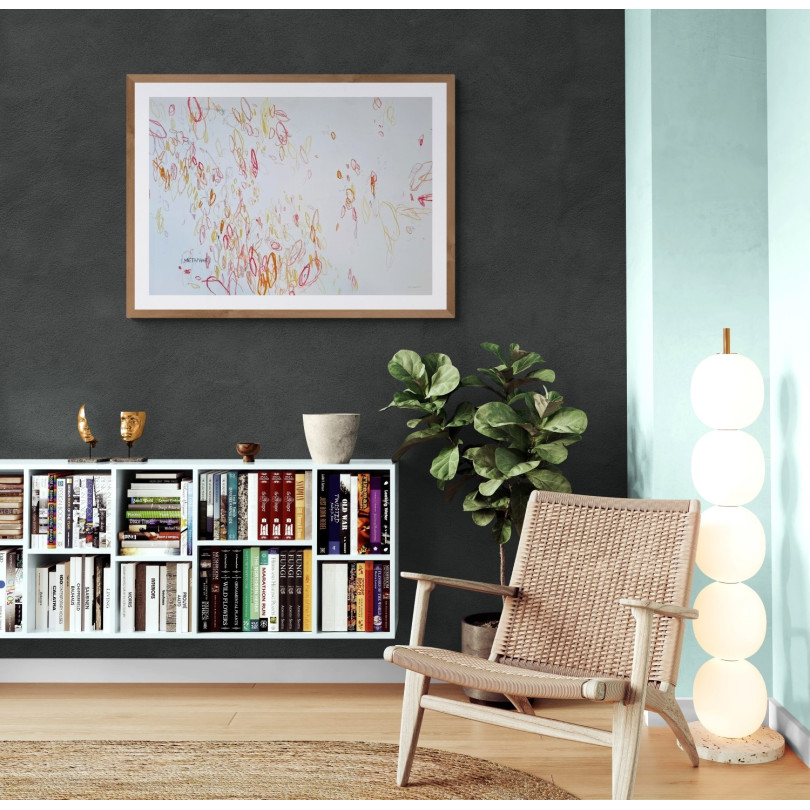 Artwork's description: This captivating contemporary piece unfolds a vibrant flow of warm colors, blending shades of red, orange, and yellow against a clean white background. The organic patterns, reminiscent of leaves or feathers, appear to float in space, creating a sense of movement and freedom. Each delicate and fine stroke merges with the others to form a harmonious and dynamic whole. The artist, The Catman succeeds in evoking a gentle energy, like an aerial dance frozen in time. The variations in density and transparency of the shapes add subtle depth and a poetic dimension to the work. This composition expresses both lightness and vitality, inviting the viewer to be swept away into a world of delicate and playful contemplation. The precise use of space and color reflects exceptional technical mastery and artistic sensitivity