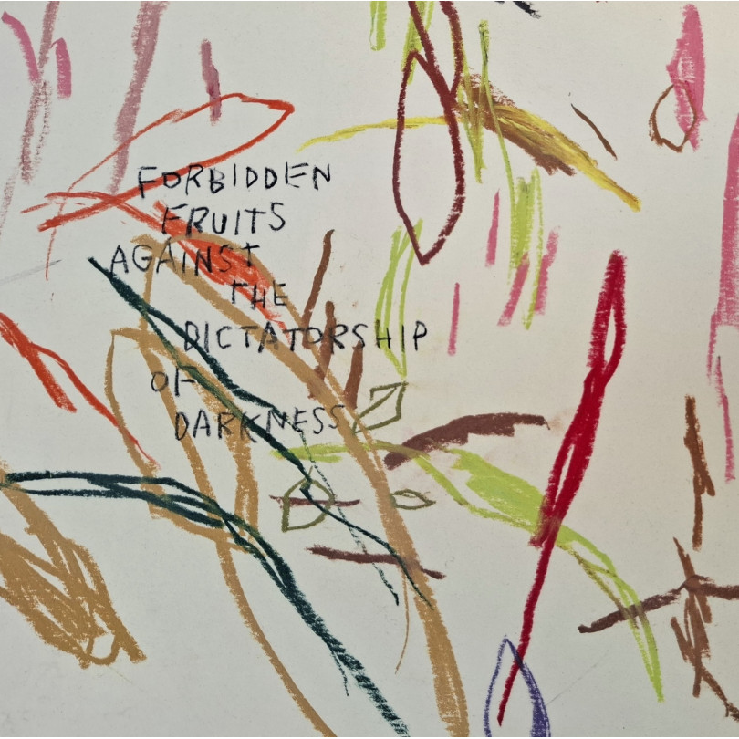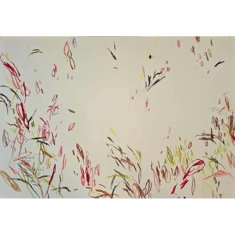 The fragmented composition conveys a sense of movement and growth, reminiscent of natural elements like plants or flowers scattered by the wind.