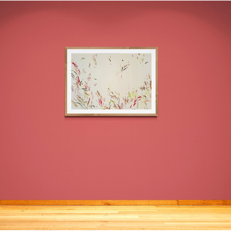 Shades of red, green, and yellow subtly blend into the neutral background, evoking a harmonious dance of organic forms.