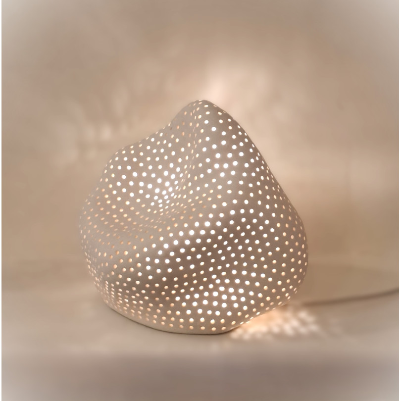 This table lamp, with its delicate, organic shapes, gently diffuses light through a constellation of tiny holes sculpted in the stoneware.