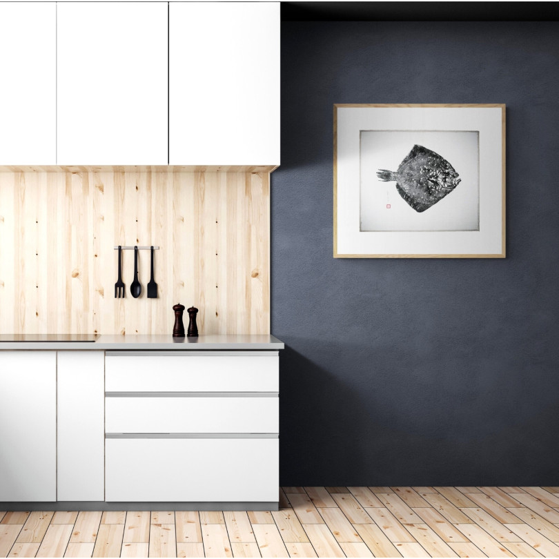 Cuadro Gyotaku, impresíon de un pez - Rodaballo, sobre papel. Pieza única del artista G. Lecup para ICI ET LÀ