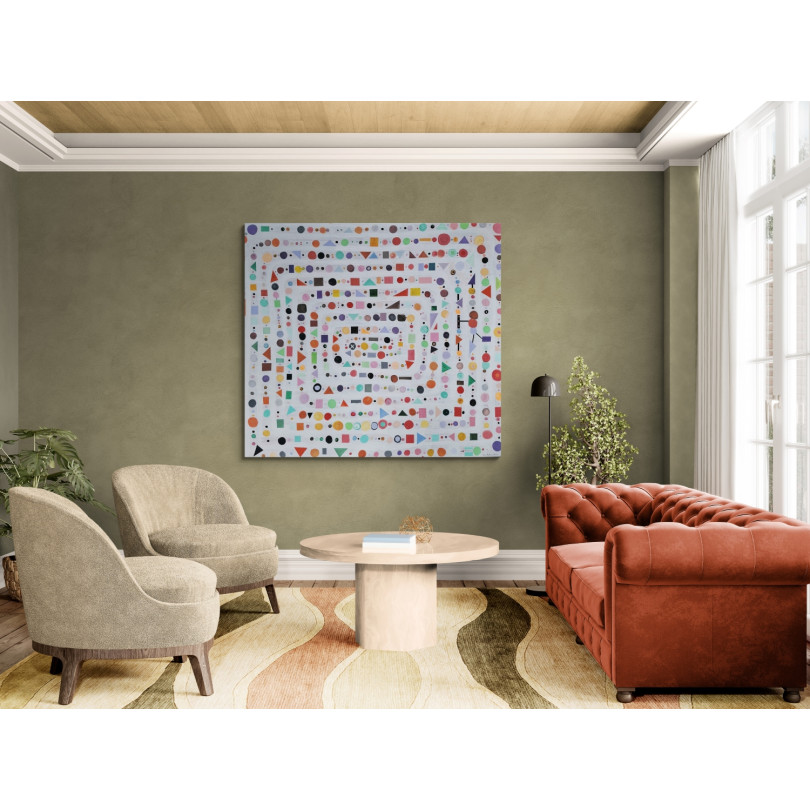 Une spirale élégante de formes géométriques colorées crée une composition hypnotique et dynamique. Entre rigueur et expérimentation, cette œuvre vibrante mêle ordre et créativité, invitant à un voyage visuel captivant dans un véritable labyrinthe chromatique