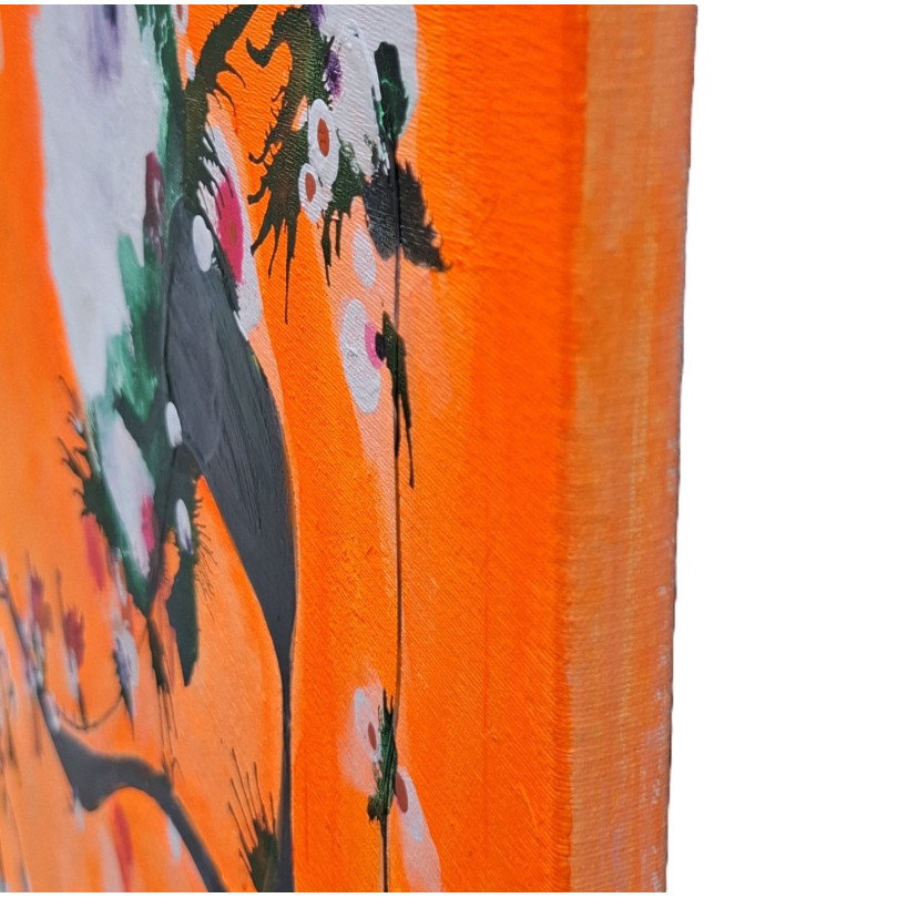 Cette œuvre captivante mêle un fond orange éclatant à des motifs floraux délicats, créant une tension visuelle entre énergie et fragilité. Elle célèbre la beauté naturelle à travers une exploration audacieuse de la couleur, du mouvement et de l’abstraction.