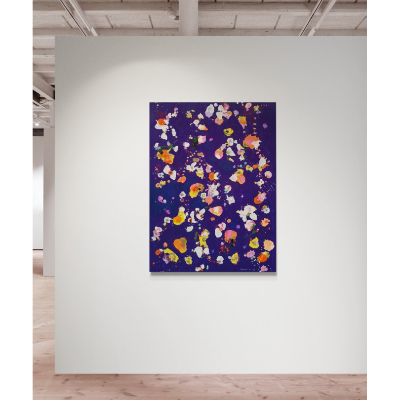 Cette peinture abstraite explose de couleurs vibrantes sur un fond violet profond, créant une danse visuelle dynamique et harmonieuse. Elle évoque une expansion cosmique et révèle une maîtrise remarquable de la couleur et de la composition.