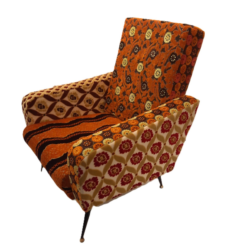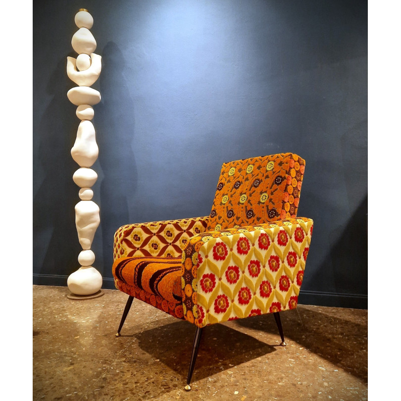 Fauteuil MANGUE de style bohème chic, création et réalisation de Maguela Tarami pour ICI ET LÀ. Collection 2025. Les sièges de Maguela Tarami se caractérisent par un travail de tapisserie original composé d’une joyeuse combinaison de velours colorés et aux motifs variés. Chaque fauteuil de cette collection est une pièce unique.
