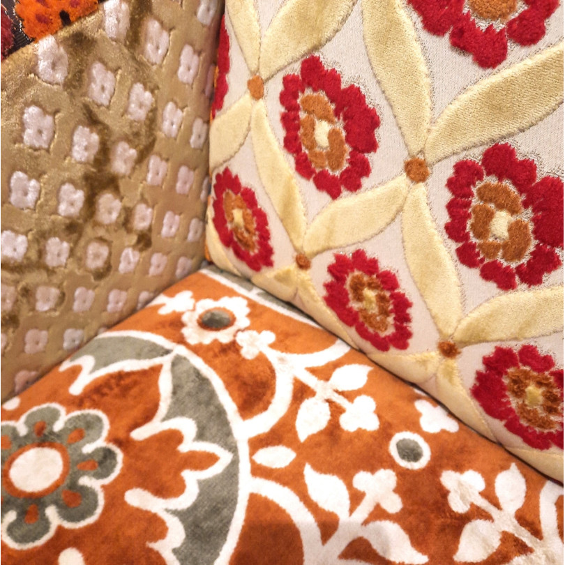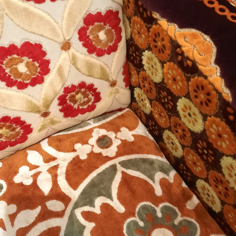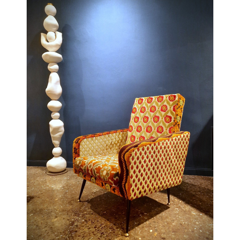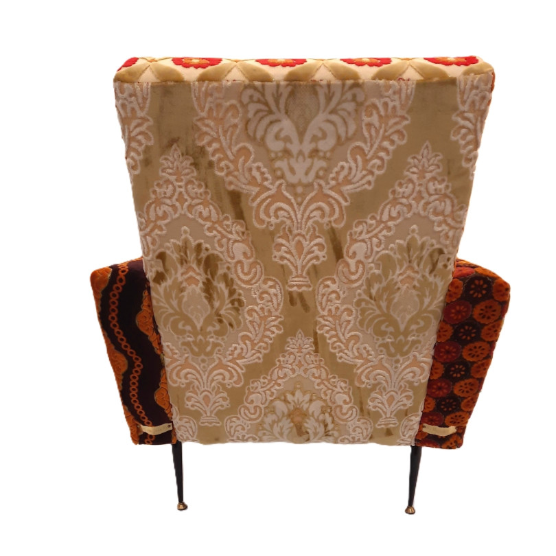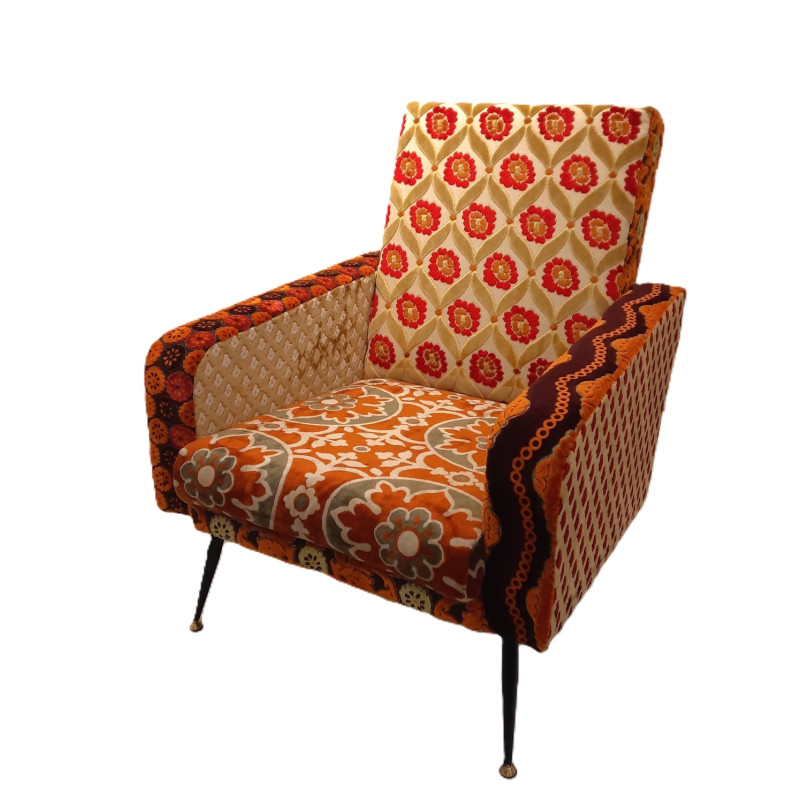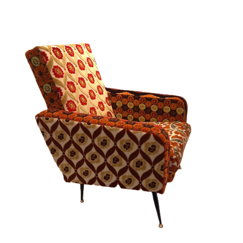 Fauteuil PAPAYE de style bohème chic, création et réalisation de Maguela Tarami pour ICI ET LÀ. Collection 2025. Les sièges de Maguela Tarami se caractérisent par un travail de tapisserie original composé d’une joyeuse combinaison de velours colorés et aux motifs variés. Chaque fauteuil de cette collection est une pièce unique.